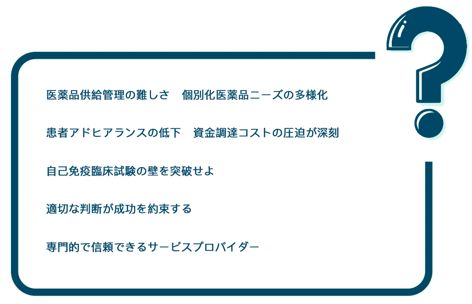 自己免疫疾患は一般的に慢性疾患に分類されるため、臨床研究においては治療効果と安全性を評価するために、長期的な観察とフォローアップが必要となります。患者のアドヒアランスは臨床試験結果の信頼性に決定的な影響を及ぼすため、医薬品の正確な配分と治療プロトコールの遵守状況については、効率的なモニタリングと管理体制の構築が不可欠です。